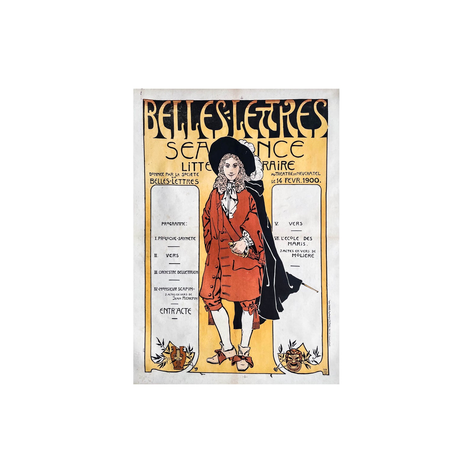 | Texte | Belles-Lettres, Séance, Littérature. Donnée par la Société de Belles-Lettres au Théâtre de Neuchâtel le 14 février 1900. Programme : ... Monsieur Scapin, 2 actes en vers de Jean Richepin... L'Ecole des Maris, 3 actes en vers de Molière. |